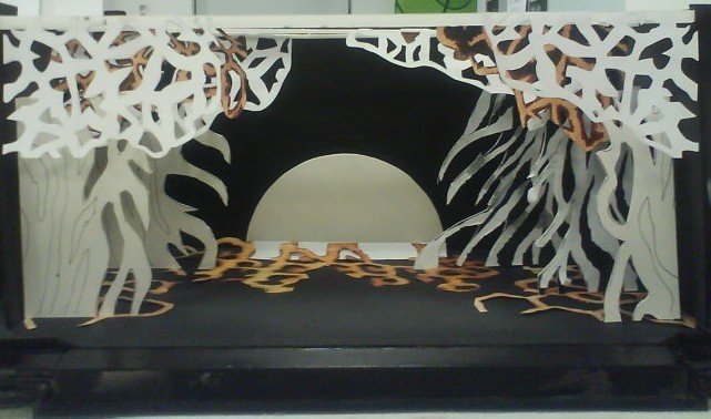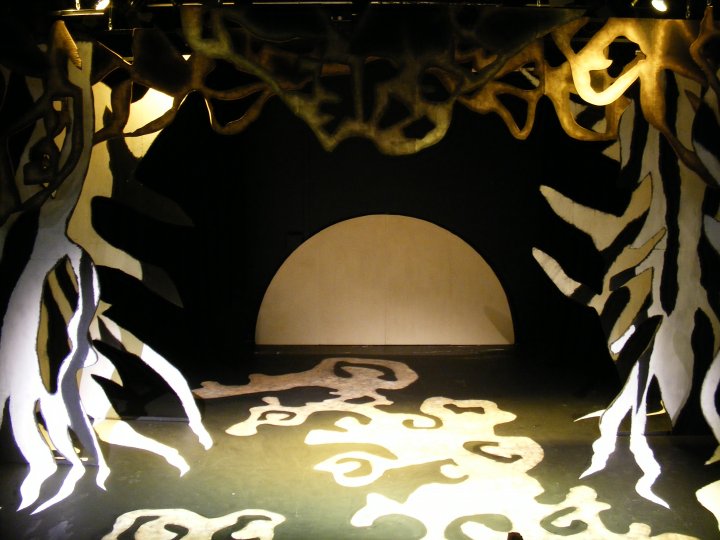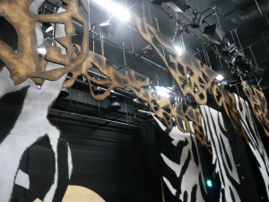 After playing with various shapes and forms, we found that by isolating and abstracting the print of animals, we could build up an abstract jungle frame for the action on stage. Cut from large foam panels (aquired for free) and hung from the lighting grid, with this set we managed to fill all of the criteria we were given.